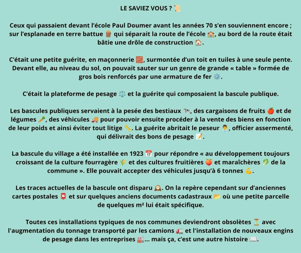 saviez-vous Admin 25 août 2025 0 Commentaires Le saviez-vous ? — Troisième édition de votre rendez-vous découverte ! Il fut un temps où, devant l’école Paul Doumer, trônait une bascule publique . Bestiaux, fruits, légumes, véhicules… tout y passait pour être pesé avant la vente . Installée en 1923, elle pouvait supporter jusqu’à 6 tonnes . Et si on replongeait dans l’histoire de cet outil oublié ?